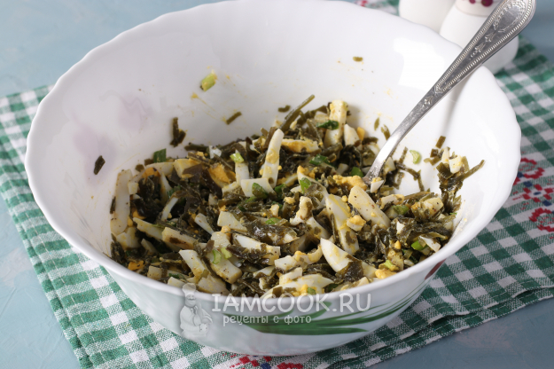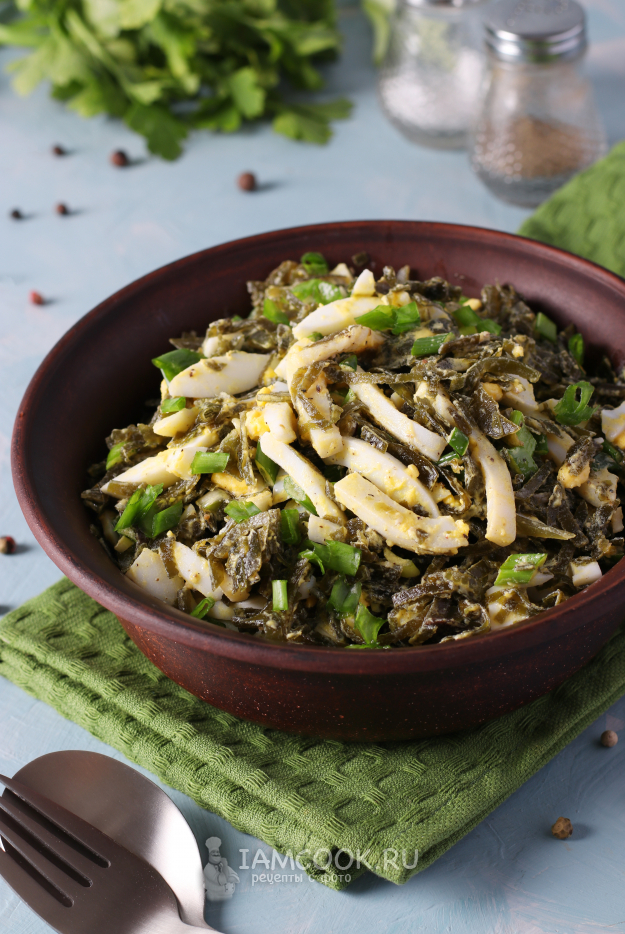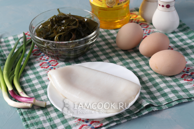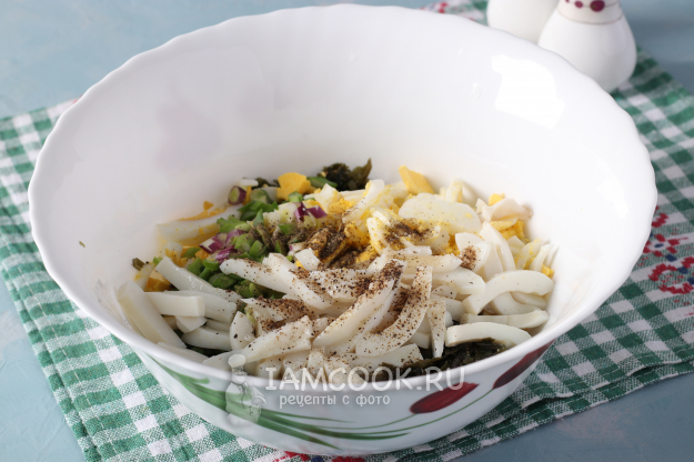 В глубокий салатник выложить морскую капусту, яйца, кальмара и измельчённый зелёный лук. Салат посолить и поперчить по вкусу.