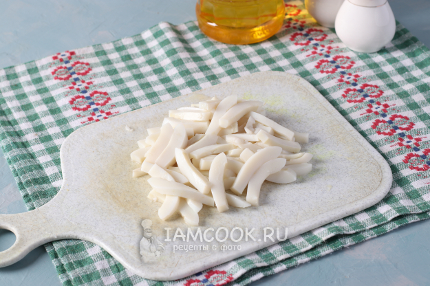 Очистить кальмара от плёнки и также нарезать его соломкой.