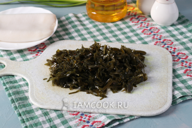 Морскую капусту немного измельчить, чтобы не осталось длинных лент.