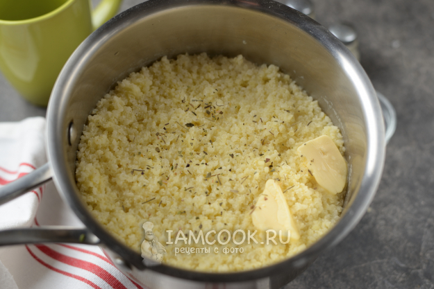 Когда каша будет полностью готова, посолите ее по вкусу, поперчите, всыпьте щепоть прованских или итальянских трав, положите кусочек сливочного масла, перемешайте, выключите плиту. Оставьте кашу под крышкой еще на 10 минут, дайте ей полностью дойти до готовности и набухнуть.