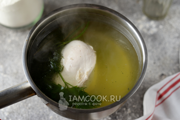Бульон я всегда варю накануне. Для этого в кипящую воду кладу половину куриной грудки, добавляю к ней укроп и петрушку, перец горошком и лавровый лист. Варю на умеренном огне 15-20 минут, зависит от веса курятины.