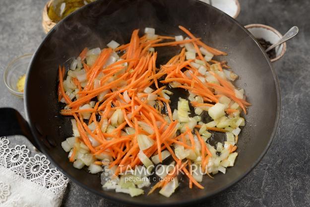 Разогрейте в сковороде растительное масло, выложите в него нарезанный лук и морковь, обжарьте на умеренном огне минуты 3-4, до мягкости.