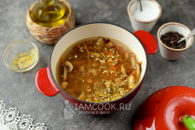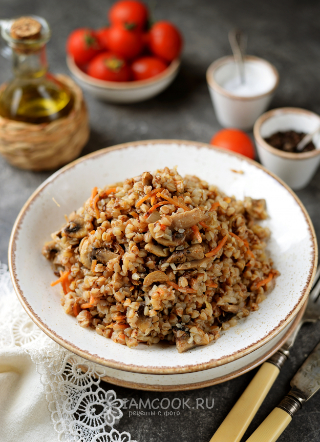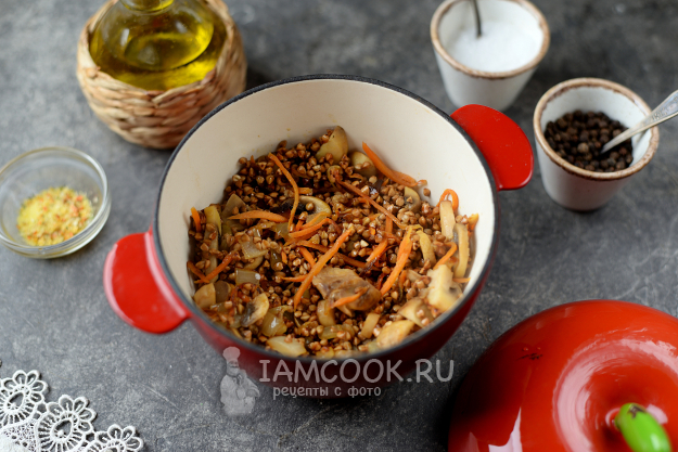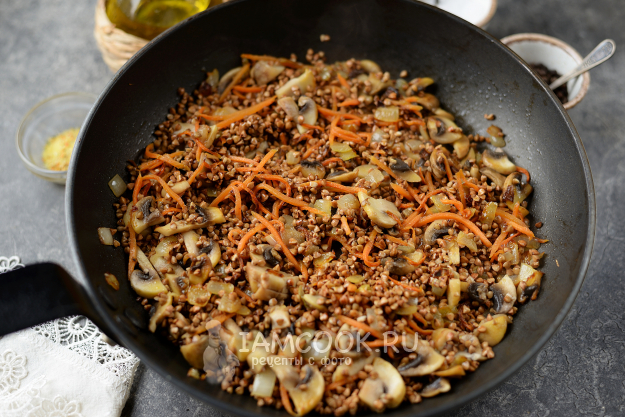 Гречку промойте тщательно, переложите в сковороду, перемешайте, дайте минуту пропитаться ароматами грибов и овощей.