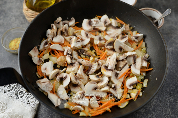 Шампиньоны помойте, обсушите, нарежьте тонкими ломтиками, переложите в сковороду, накройте крышкой. Грибы сразу же пустят сок и на их приготовление у вас уйдет также минуты 3-4.