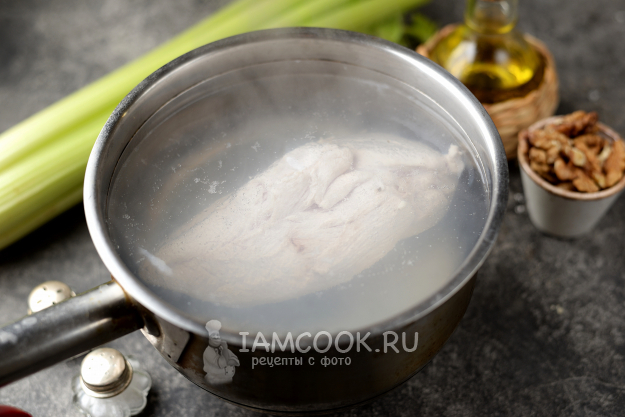 Вскипятите в сотейнике воду, чуть подсолите, выложите в нее куриное филе. Варите минут 15-20, спустя время извлеките и остудите курятину.