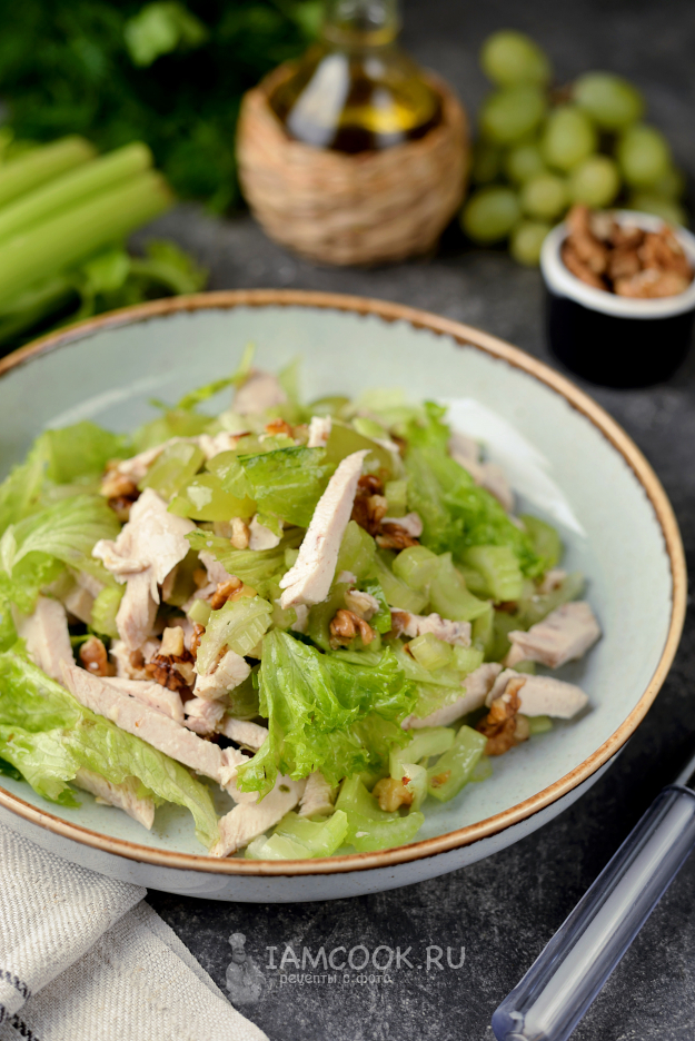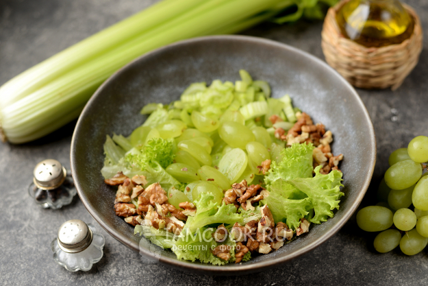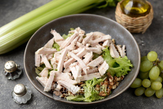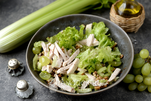 Вкуснейший салат с куриной грудкой, сельдереем и виноградом подавайте как перекус между основными приемами пищи.