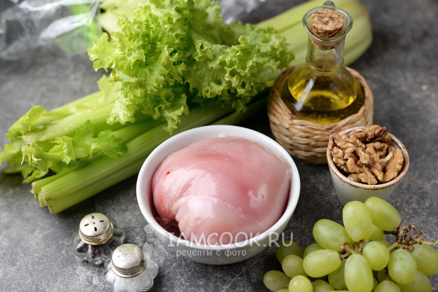 Возьмите все продукты для приготовления салата с курицей, сельдереем и виноградом. Сельдерей, латук и виноград помойте и обсушите.