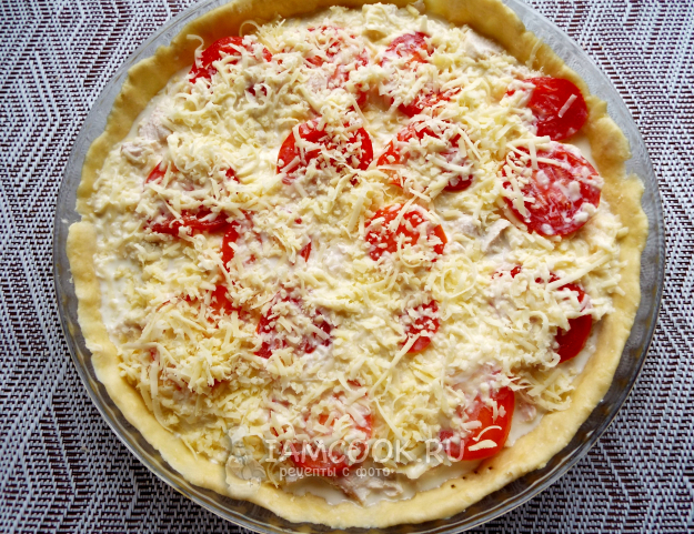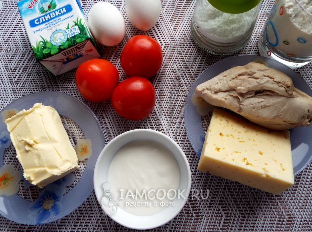 Вот такие продукты нам нужны для приготовления киша с курицей и помидорами.