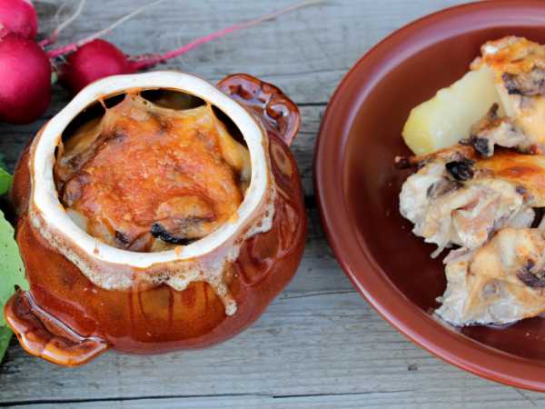 Горшочки поставить в духовку без крышечек, выставить температуру 180 градусов и запекать 50 минут. Сыр сверху образует хрустящую румяную корочку. Советую ориентироваться на свою духовку: если увидите, что сыр уже достаточно запёкся, проверьте готовность мяса вилкой. Возможно, у вас блюдо будет готово раньше. Пока мясо будет запекаться, вы можете сварить на плите любой гарнир.