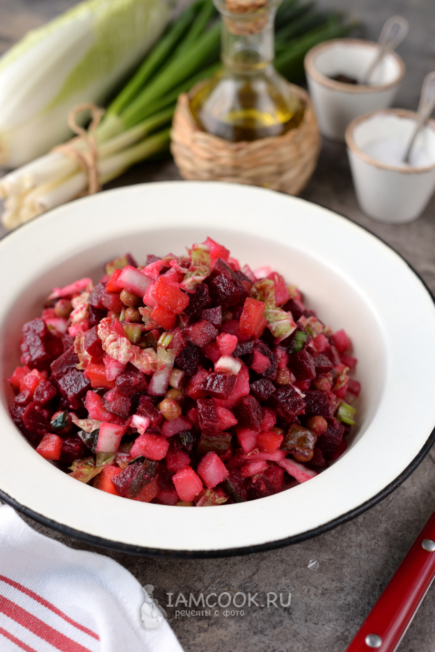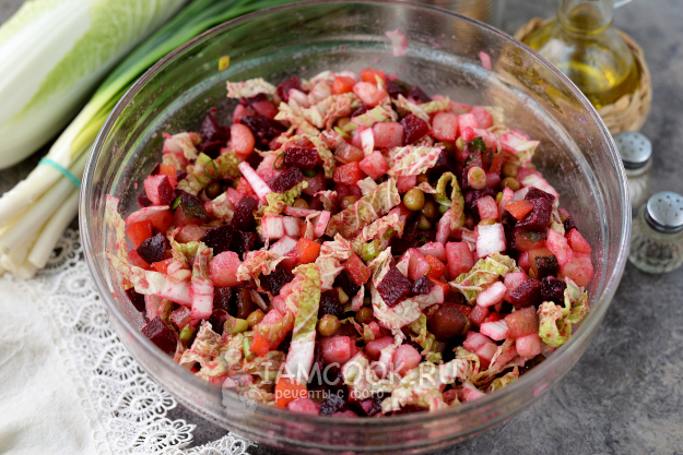 Вкусный и полезный винегрет с пекинской капустой можно подать даже как гарнир к любому мясу.