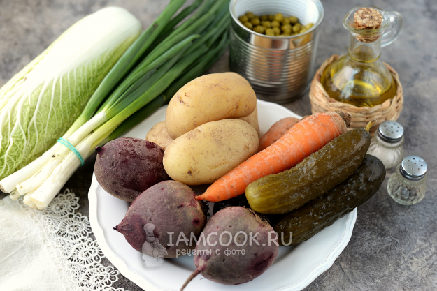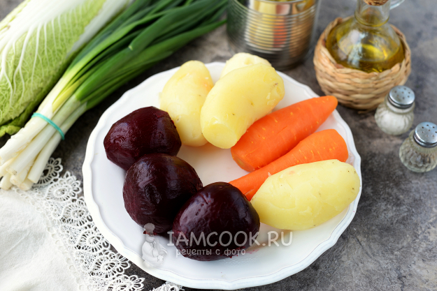 Возьмите все продукты для винегрета с пекинской капустой по списку. Свеклу, морковь и картофель помойте жесткой кухонной щеткой под проточной водой, сложите овощи в казан и отварите до готовности. Картофель и морковь сварятся минут за 15-20, в зависимости от размеров самих овощей, а свекла обычно варится до 50 минут.