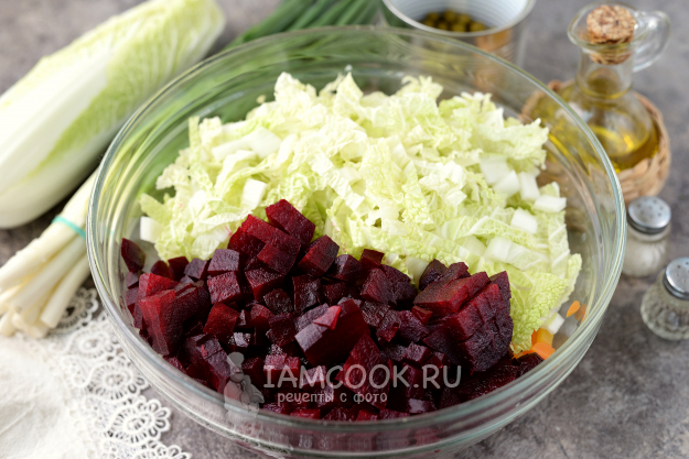 Последними положите свеклу и тонко нарезанную пекинскую капусту. Капусту желательно нарезать с нижней волокнистой частью, она наиболее полезна.