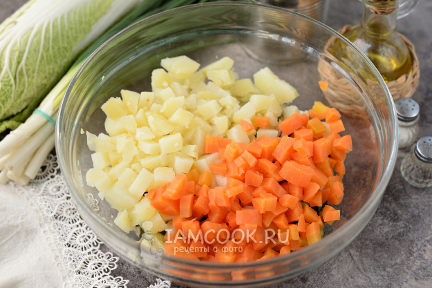 Дальше можно нарезать картофель и морковь небольшим кубиком, добавить их в миску.