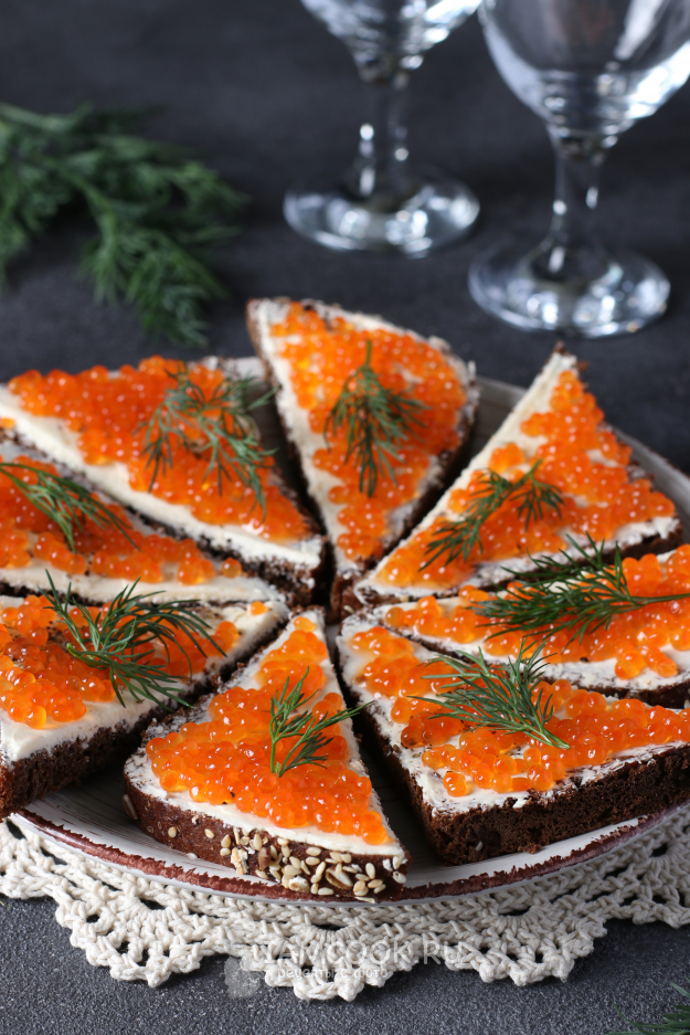 Бутерброды являются неотъемлемой закуской любого праздничного стола, а с красной икрой - одни из самых популярных. Считается, что для бутербродов с икрой идеально подходит батон или белая булка, но если вы по какой-то причине не едите белый хлеб, то бутерброды можно приготовить и с чёрным (ржаным) хлебом. Уверяю, это так же вкусно! Мы в последнее время чаще покупаем ржаной хлеб и поэтому для бутербродов я тоже его использую.