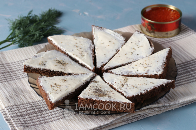 Если кусочки хлеба великоваты, можно разрезать их на треугольники. Намазать хлеб тонким слоем сливочного масла и посыпать чёрным перцем. Соль я не добавляю, так как икра достаточно солёная.