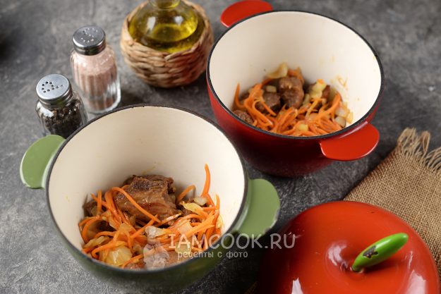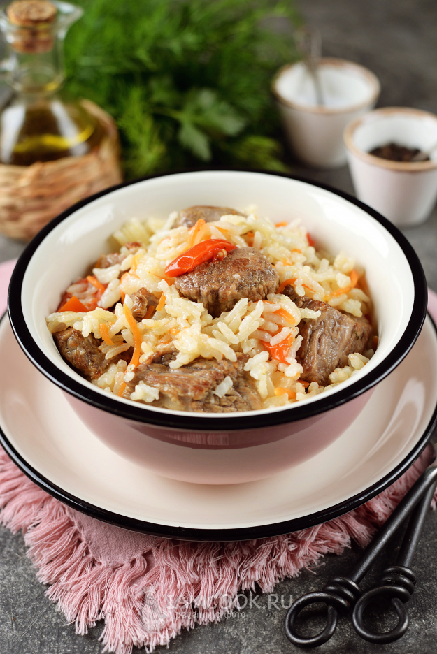 Накройте горшочки крышками, отправьте в предварительно разогретую до 200 градусов духовку без конвекции на 30 минут, спустя время уменьшите температуру до 180 градусов и готовьте еще 1 час. Извлеките горшочки с пловом из говядины из духовки, но крышки не открывайте еще минут 10-15, за это время рис впитает все соки и ароматы овощей и мяса.