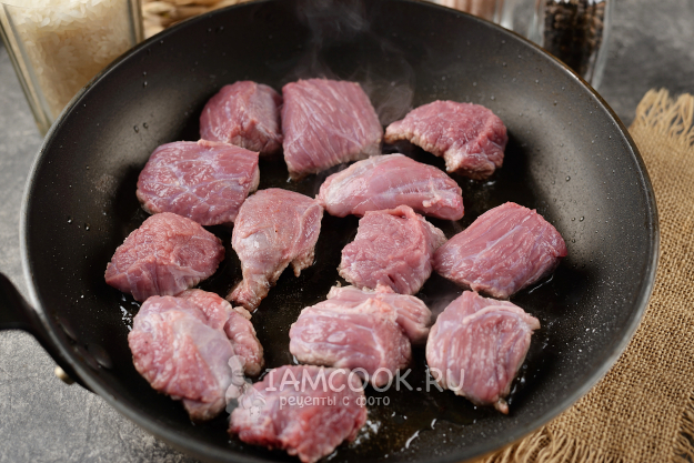 Разогрейте в сковороде растительное масло, положите в него нарезанную крупными кусочками говядину, быстро обжарьте на сильном огне со всех сторон до румяной корочки. Уменьшите огонь до среднего или тихого и жарьте мясо еще минут 15, а то и 20.