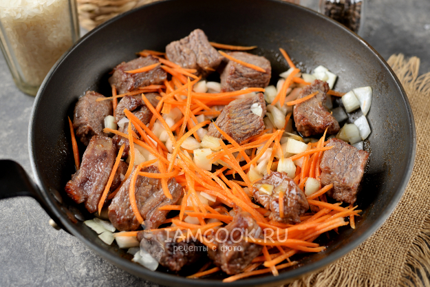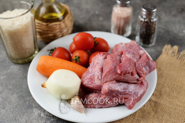 Для приготовления плова с говядиной в горшочках в духовке нам понадобятся все продукты на фото. Говядину зачистите от жилок и пленок, помойте и обсушите вместе с очищенными луком и морковью.
