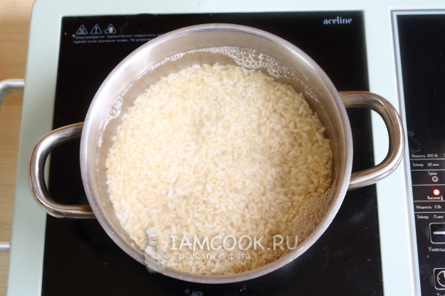 Варите на небольшом нагреве до впитывания жидкости и готовности риса. Это займет около 15-20 минут.