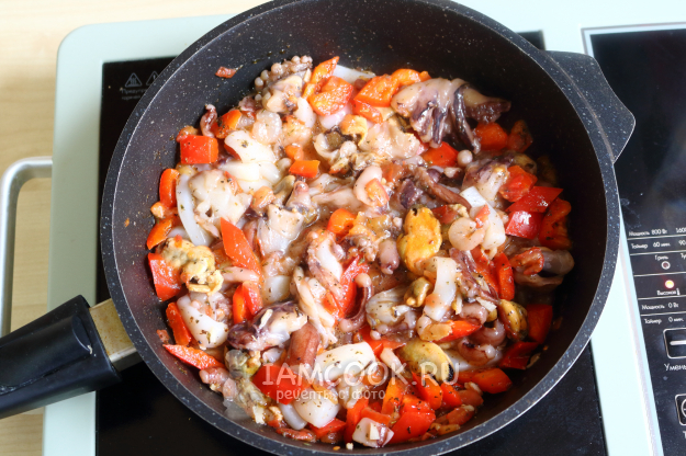 Отправьте к овощам размороженные морепродукты и готовьте, помешивая, ещё 2-3 минуты, но не более!