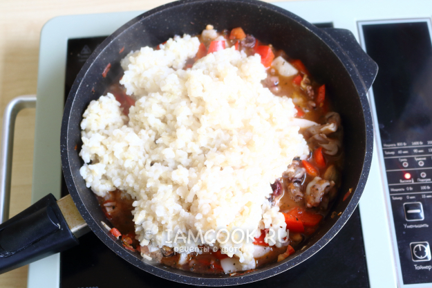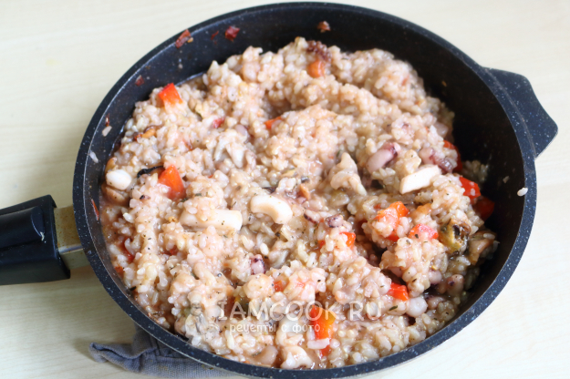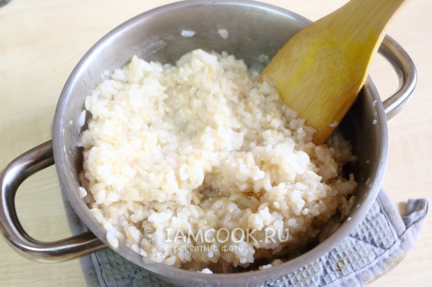 Быстро выложите рис, перемешайте до однородности и снимите с плиты.