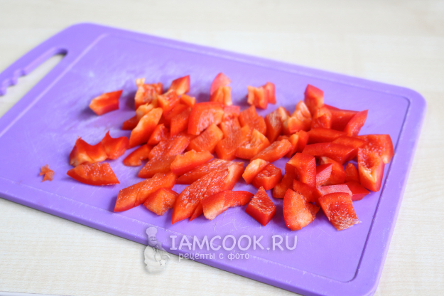 Красный болгарский перец нарежьте средним кубиком. Не забудьте помыть и удалить семечки и плодоножку.