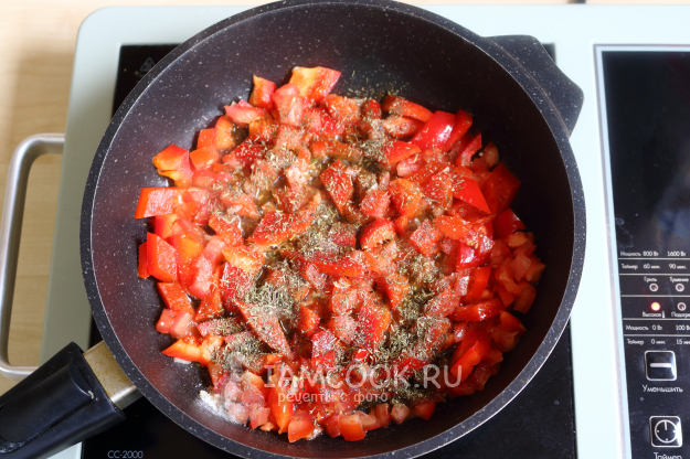 Добавьте перец и помидор, всыпьте специи: соль, перец, сушеные базилик и тимьян.