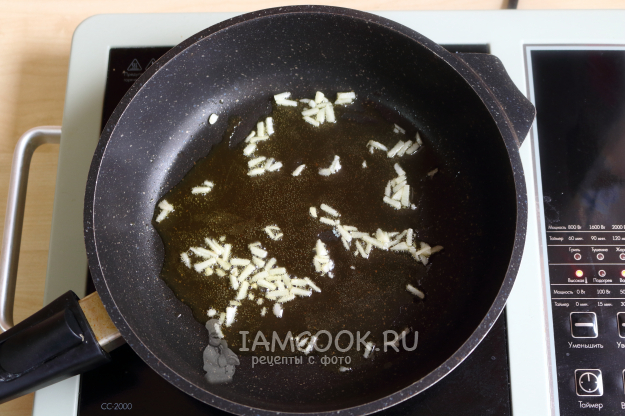 Сковороду разогрейте, влейте масло и обжарьте минутку измельченный чеснок.