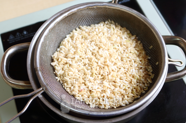 Бурый рис замочите в воде на 30-60 минут, чтобы оболочка разбухла и крупа сварилась быстрее. Затем промойте рис под проточной водой.