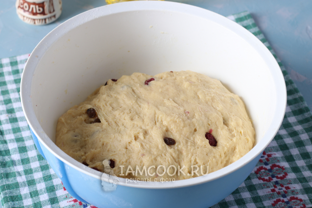 Вмешать в тесто изюм. У меня изюм и вяленая клюква - 50/50.