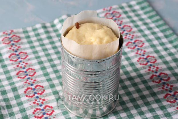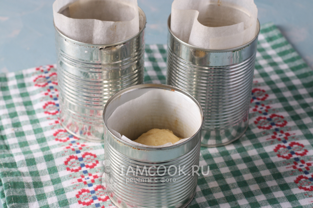 Тесто разложить по формочкам, выкладывая их на 1/3, так как тесто очень хорошо поднимается. Убрать формы в тёплое место, пока тесто в формах не поднимется до верха. Поскольку у нас в квартире сейчас уже отключено отопление, я выставила в духовке температуру 40 градусов и поставила формы туда.