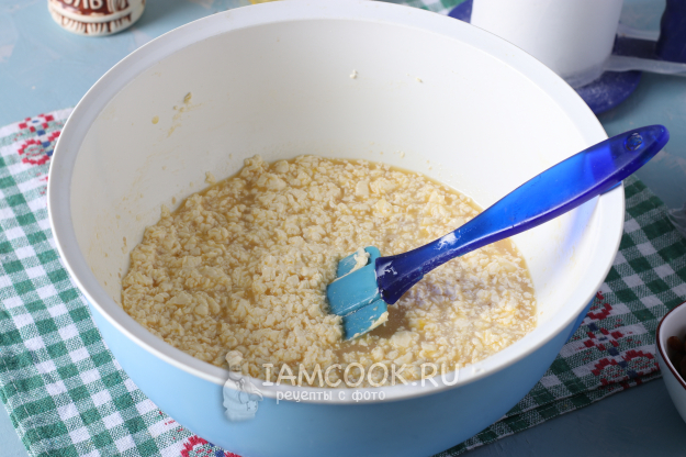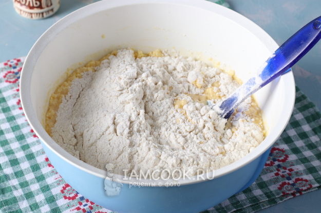 Влить в тесто коньяк, добавить ванилин и всю муку. Сначала перемешать тесто лопаткой.