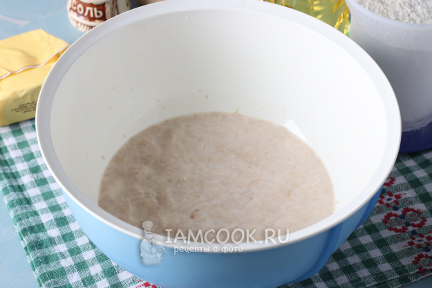Добавить мягкое сливочное масло, перемешать всё лопаткой. Миску с опарой накрыть полотенцем и убрать в тёплое место на 8-9 часов. Удобно это делать с вечера, а утром уже продолжить заниматься тестом.