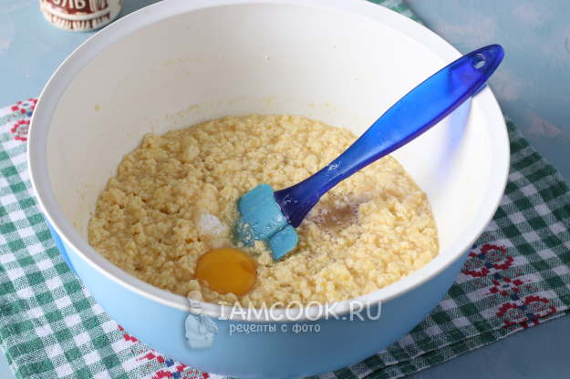 В отдельную мисочку разбить яйца комнатной температуры, взбить их венчиком и добавить в опару.