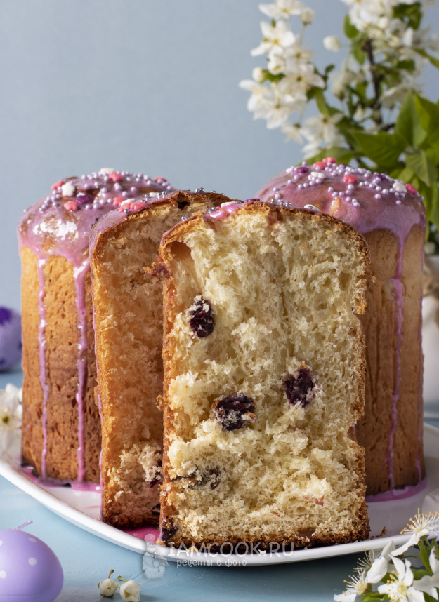Далее покрываем куличи любой глазурью, какую предпочитаете, и посыпаем разноцветной посыпкой. У меня глазурь покупная. В разрезе пасхальные куличи из александрийского теста на топленом молоке выглядят изумительно.