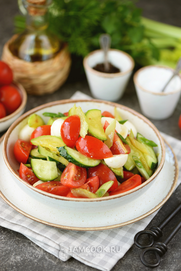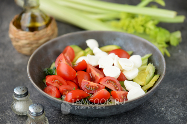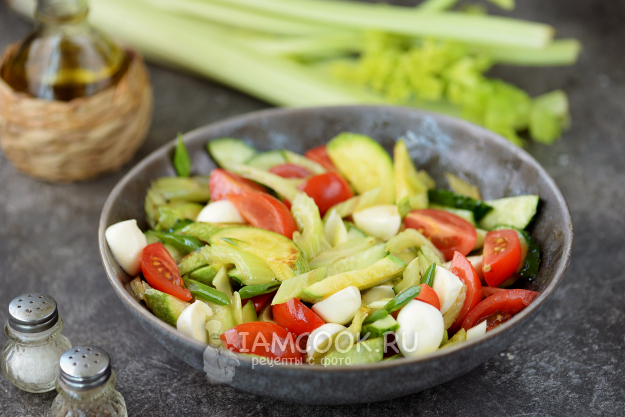 Вкусный и полезный теплый салат с сельдереем и моцареллой подавайте сразу же после приготовления.