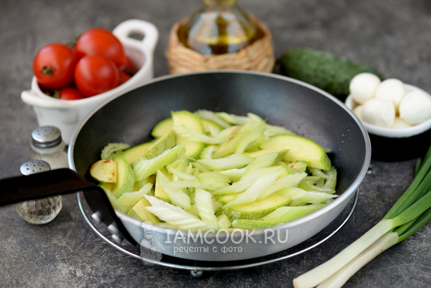 Нарежьте кабачок и сельдерей средними ломтиками, выложите в разогретое оливковое масло, быстро обжарьте на умеренном огне - минуты 3-4, овощи должны остаться хрустящими.