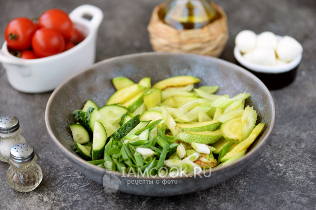 Переложите обжаренные кабачок с сельдереем в глубокую миску, сразу же добавьте нарезанный зеленый лук и огурец.