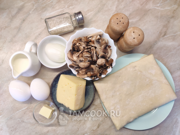 Чтобы приготовить киш из слоёного теста с грибами (шампиньонами), подготовьте все необходимые ингредиенты. Тесто к началу приготовления должно уже быть полностью размороженным. Если у вас свежие грибы, промойте их под проточной водой и нашинкуйте тонкими пластинками или средними кубиками. Оставьте несколько пластинок для украшения пирога. Лук очистите от шелухи.