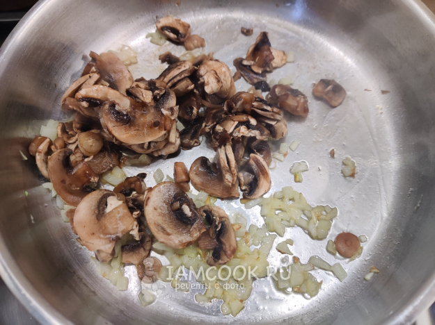 Добавьте в сковороду грибы и жарьте ещё несколько минут, пока не испарится лишняя влага. Снимите грибы с огня.
