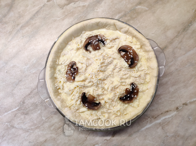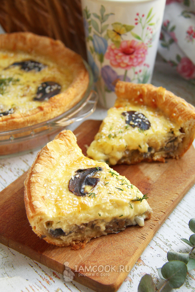 Залейте грибы яично-сливочной смесью и украсьте пирог слайсами из свежих грибов и кунжутом. Выпекайте киш из слоеного теста с грибами в заранее разогретой до 180 духовке в течение 30-40 минут до готовности.