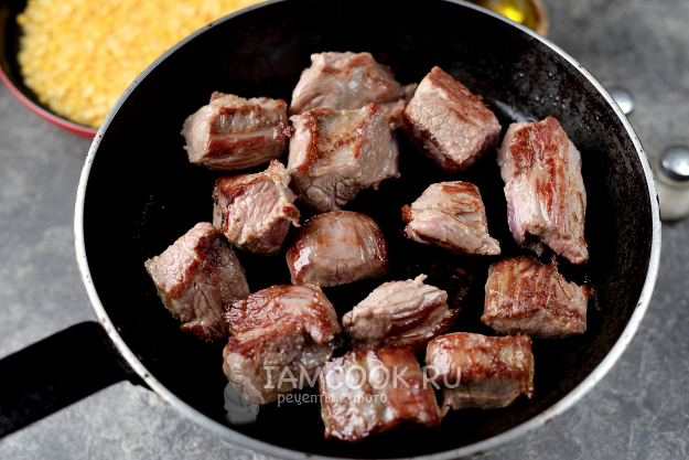 Разогрейте в сковороде растительное масло, обжарьте на нем крупно нарезанную говядину до румяной корочки со всех сторон.