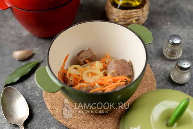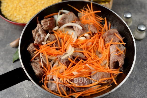 Добавьте к мясу нашинкованные лук и морковь, тушите на умеренном огне минут 5.