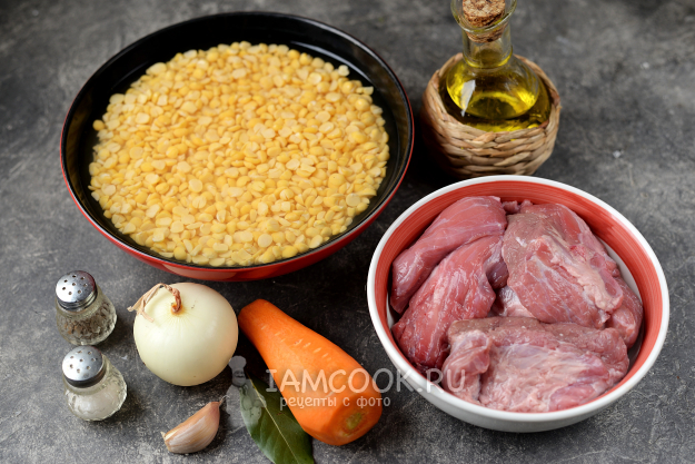 Возьмите все продукты для приготовления гороха с мясом в горшочке в духовке. Горох берите колотый, он быстрее готовится и быстрее набухает. Промойте горох, залейте его холодной водой и дайте набухнуть. Лучше это делать с вечера, тогда на следующий день готовить гороховую кашу будет проще. Почистите и помойте овощи. Говядину зачистите от жилок и пленок, помойте, вытрите насухо бумажными полотенцами.