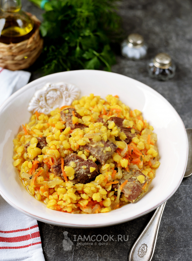 Спустя время аккуратно переложите гороховую кашу с мясом в глубокую тарелку и подавайте к столу.