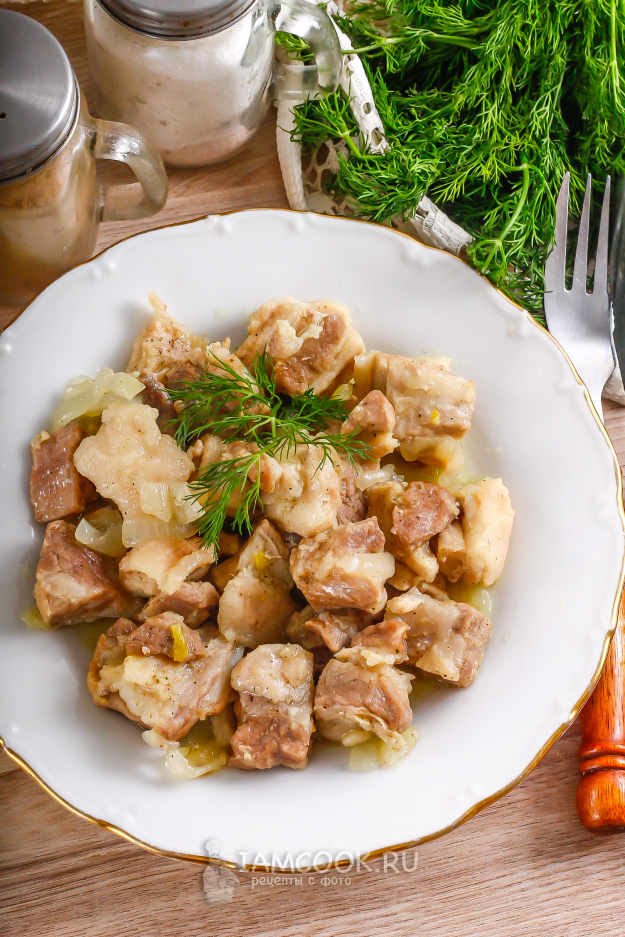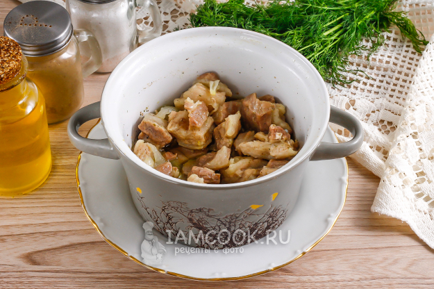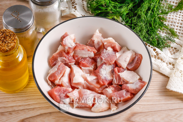 Подчеревок промойте в воде, срежьте кожу и пленки. Если используете другое мясо, возможно, вам придется вырезать еще и голубые жилы из него. Нарежьте мясо некрупными ломтиками. Помните, что чем крупнее нарезка, тем дольше она будет готовиться. Выложите нарезку свинины в глубокую емкость.