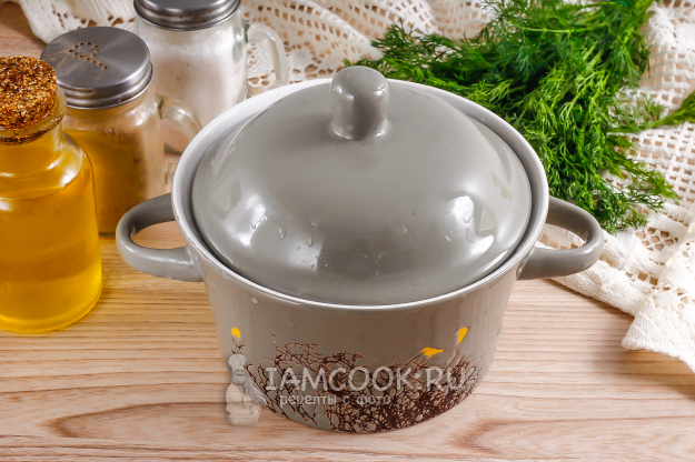 Накройте горшочек со свининой крышкой и поместите в микроволновку, включая технику на всю мощность на 10 минут.