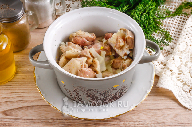 Выложите все в горшочек. Не используйте металлическую посуду или посуду с золотистыми, серебристыми рисунками! Нельзя использовать в микроволновке и фольгу!