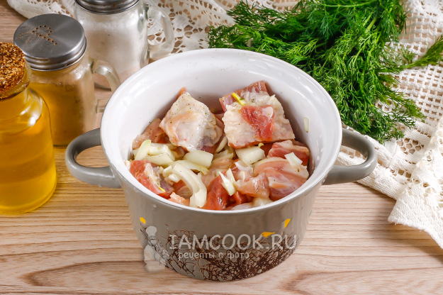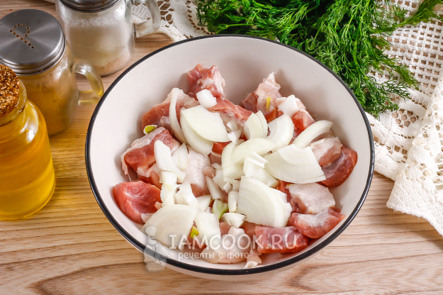 Очистите и промойте репчатый лук, нарежьте его полукольцами и добавьте в емкость к свинине.