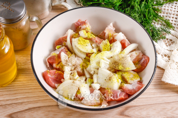 Всыпьте соль, молотый черный перец и различные специи, приправу. Влейте растительное масло и аккуратно все перемешайте, чтобы каждый кусочек мяса окутался специями и маслом.